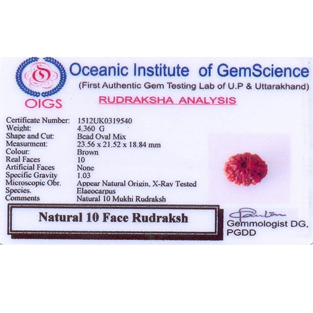 Ten mukhi Rudraksha is a symbol of Lord Vishnu (ten lord of protect) himself. This Rudraksha is incarnations, By wearing this Rudraksha one receives immense success in job, and other day to day activities.One who wear has his worldly and eternal wishes are believed to be fulfilled.This Rudraksha is also considered highly effective in social services, art and craft. The Time & Rules of Wearing Rudraksha - Eclipse, full moon day, Sankranti (a planet’s passage from one zodiac sign to another), Amavasya (the last day of the dark half of a month), Vaisakhi, pilgrimage, the bank of Ganga, MahaShivratri, Diwali, after the visit of the deity of your spiritual guide, Kumbh ceremony(mela), any Ganga-fair, or any other big ceremony of any river, any ceremony of Lord,during Navratri, Ayan(the sun’s cross north to south of Equator or vice-versa) or any other good day.The Identification of Original Rudraksha - There is no machine to identify the Rudraksha without destroying it. There are some thread like forms with its faces. Face is that which is alone part with its own pieces. If we break the Rudraksha its faces will break as the slice-piece of musk melon. In very rare cases, two Rudraksha may be same. Always remember that nature, and nature grows the piece as it wants not as we wants. The faces and the threads on Rudraksha is a wonderful work of nature. The sinking one is original, the black,red or yellow is original or revolving between two copper-coins as be identified by an old person of his time so always purchase the Rudraksha from a faithful medium or shopkeeper.