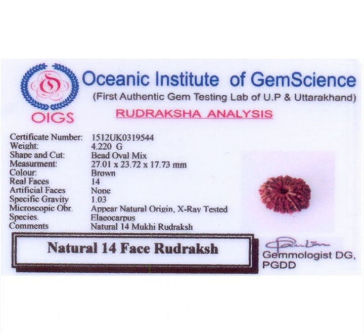 14 Mukhi Original bead with Originality Certificate. 14 Rudraksha is also called Devamani. 14 mukhi rudraksha is the most precious divine thing. Known to have been directly produced from the eye of rudra. It helps in taking Right and quick decisions. Controls the ajna chakra (between 2 eyebrows). Improves visualization power on wearing on ajna chakra. Protects the wearer and helps to make correct judgment in their action/plan. Wearer purifies the ancestors and forefathers. Helps to improve the present, corrects the past, and makes the future positive and foreseen. Helps in increasing power of eight chakras. Improves intuitive thinking. Corrects stammering. Helps in gynecological problems. Helps to judge people in better, effective manner. Worn for better future sight, visualization power, meditation. Protects from all calamities, miseries, worries. Provides safety and riches. Chauda face bead brings the fearless mind within us. It is the appropiate bead for Industrialist, people related to land business and construction, people in high authority and power. This bead have energy of Lord Hanuman. It is mentioned that Lord Hanuman being a divine incarnation of Lord Shiva represents devotion and dedication to his master Lord Rama. The ancient seers conclude that Hanuman had a mastery over all the senses. Therefore, anyone who is unable to control their senses may wear a 14 Mukhi Rudraksha bead.