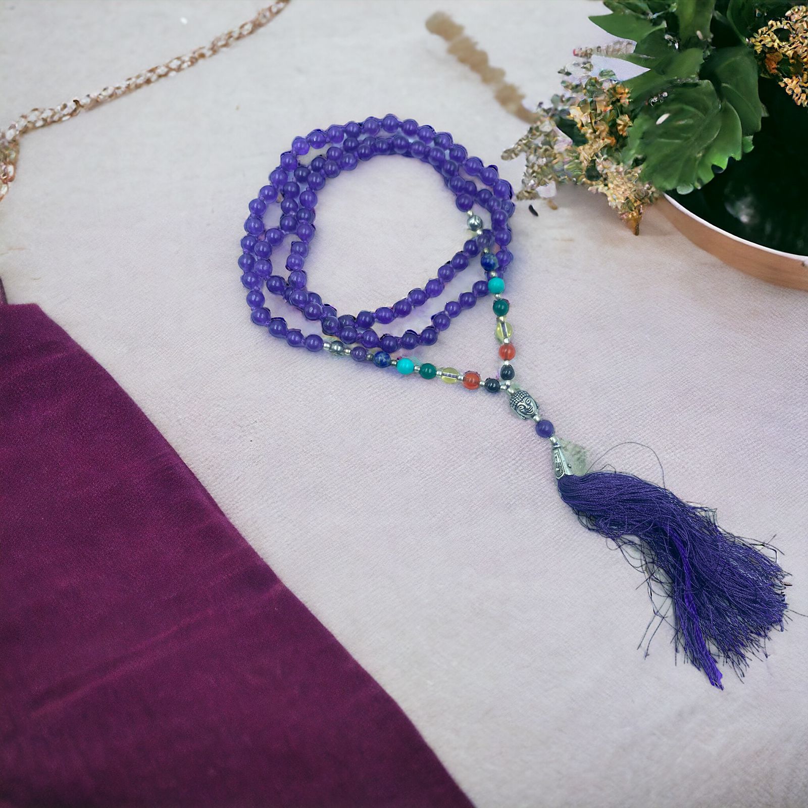 This is a beautiful Multicolour Healing 7 Chakra stone Mala. Blue green genuine turquoise round shape stones make up this semi-precious stone Mala. Chakra is a Sanskrit word for a series of circular wheels of energy, in and around the body. It is believed that we have energy centers in the soles of our feet and the center of our palms. The 7 chakras line up in the center of your body. Each chakra is associated with a color, musical note, shape, belief system, element and specific crystals. The 7 chakras offer valuable information to help heal the mind, body and spirit. Our Chakra Healing Bracelets were created with powerful chakra stones— one or more for each of your 7 chakras—to balance, cleanse and align your chakras. These specific stones were chosen for their ability to work together and amplify each other’s energy and healing properties.
