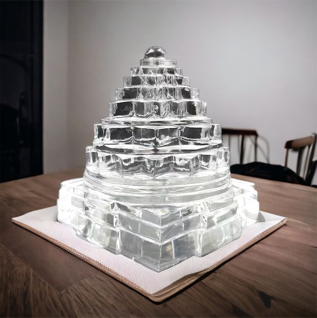 The Sphatik Shree Yantra with pyramid structure is accurately chiseled out of high-quality Sphatik gemstone. Sphatik Shree Yantra symbolizes a total of 2816 Goddesses and energies bestows the worshiper with all their blessings. The highly revered Sphatik Shree Yantra has the ability to grant totality in life. Sphatik Shree Yantra cleanses and energizes the aura, invites good fortune, and increases love and compassion. Placing the Sphatik Shree Yantra on the east side of your dwelling will bless you with materialistic comforts and aid spiritual progress. Siddha Sphatik Shree Yantra by Rudra Divine is a huge store of divine powers. Placement: Sphatik Shree yantra energizes the location where it is installed. You may place it in your Puja room facing North, East, or North-East direction. North-East is also called the Eshaan corner and is recognized as the place of God. This direction is seen as a highly charged place as it is the confluence of energies coming from the North magnetic pole and sun rays from the East. The Sphatik Shree yantra placed here gets charged with divine vibrations from the universe and provides positive transformation energy to the dwelling through its mystical geometry.