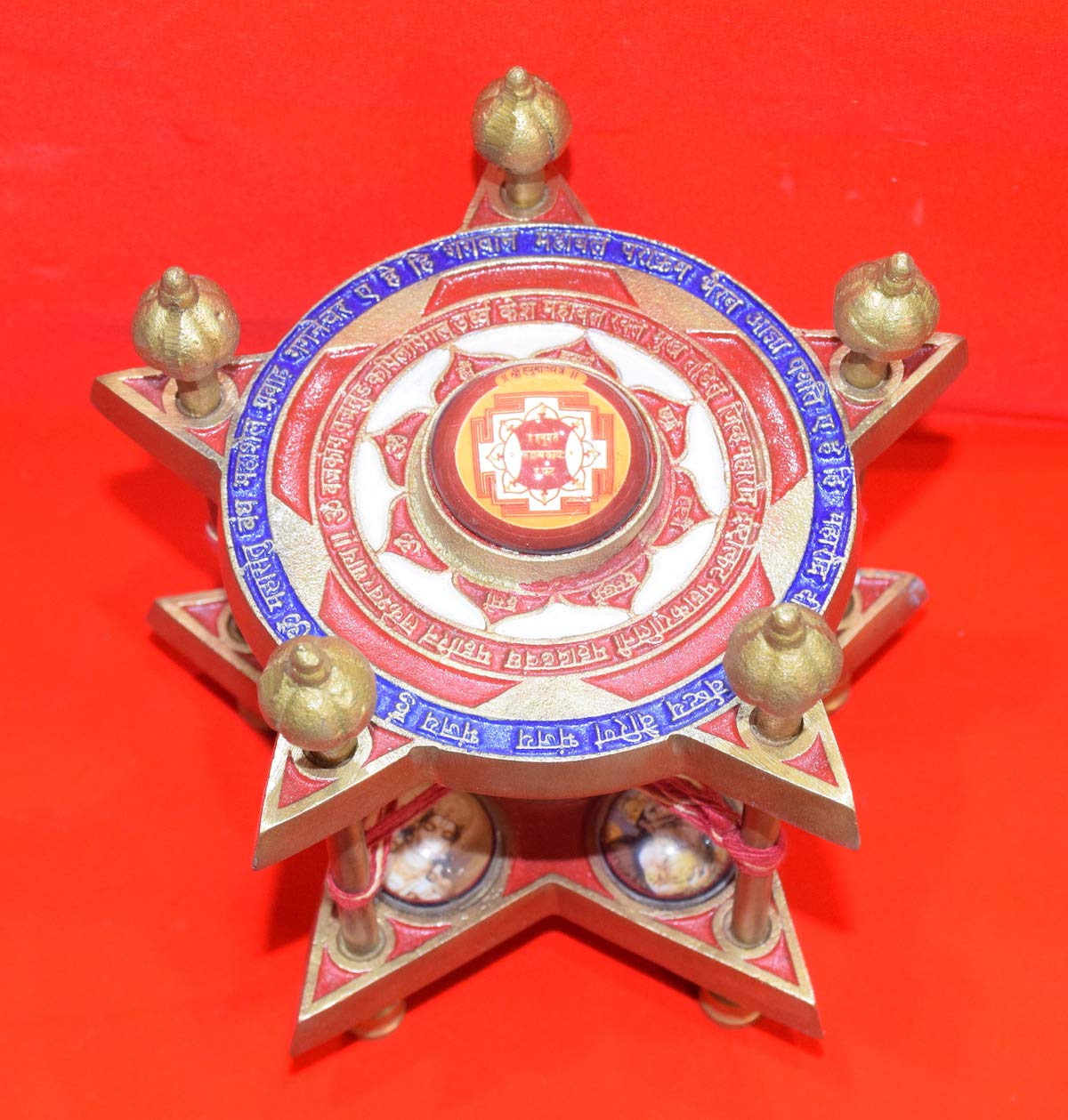 Sri Panchmukhi Hanuman Yantra Chowki with Panchmukhi Hanuman idol A powerful yantra chowki for worshipping Lord Hanuman. It has images of the 5 forms of Lord Hanuman. In the center sits a brass idol of Lord Hanuman. Installed on the top of the chowki , is the Panchamukhi Hanuman yantra. The chowki has five pillars with Hanuman ji’s mace on each pillar. This Panchmukhi Hanuman yantrachowki has a beautiful Panchmukhi Hanumana idol ,Panchmukhi Hanumana yantra , few beautiful images of Sri Hanumana surrounded by Mace (Gada) of Sri Hanuman ji from all sides. This Chowki has been made in heavy metal with glass covering on all images and yantra, that gives it an augmented view. Dimensions : 139X135X1135 Weight : 960 gm (approx.) Disclaimer: • Product colour may slightly vary due to photographic lighting sources or your monitor settings Note: The image has been enlarged for better viewing • Keep it away from perfume, sprays and water • Warranty: Shiva RudrakshaRatna provides a 15 days refund provided stone is not broken or scratched • The customer should present the bill at the time of refund along with certificate • Refund conditions: mishandling, broken, scratched will not be subjected to refund • Care: This stone is brittle, handle with care • Instruction: Do not keep this stone wrapped in cotton as it may absorb the water from the stone and can cause damage. • Descriptions for products are taken from scripture, written and oral tradition. Products are not intended to diagnose, treat, cure, or prevent any disease or condition. We make no claim of supernatural effects. All items sold as curios only.