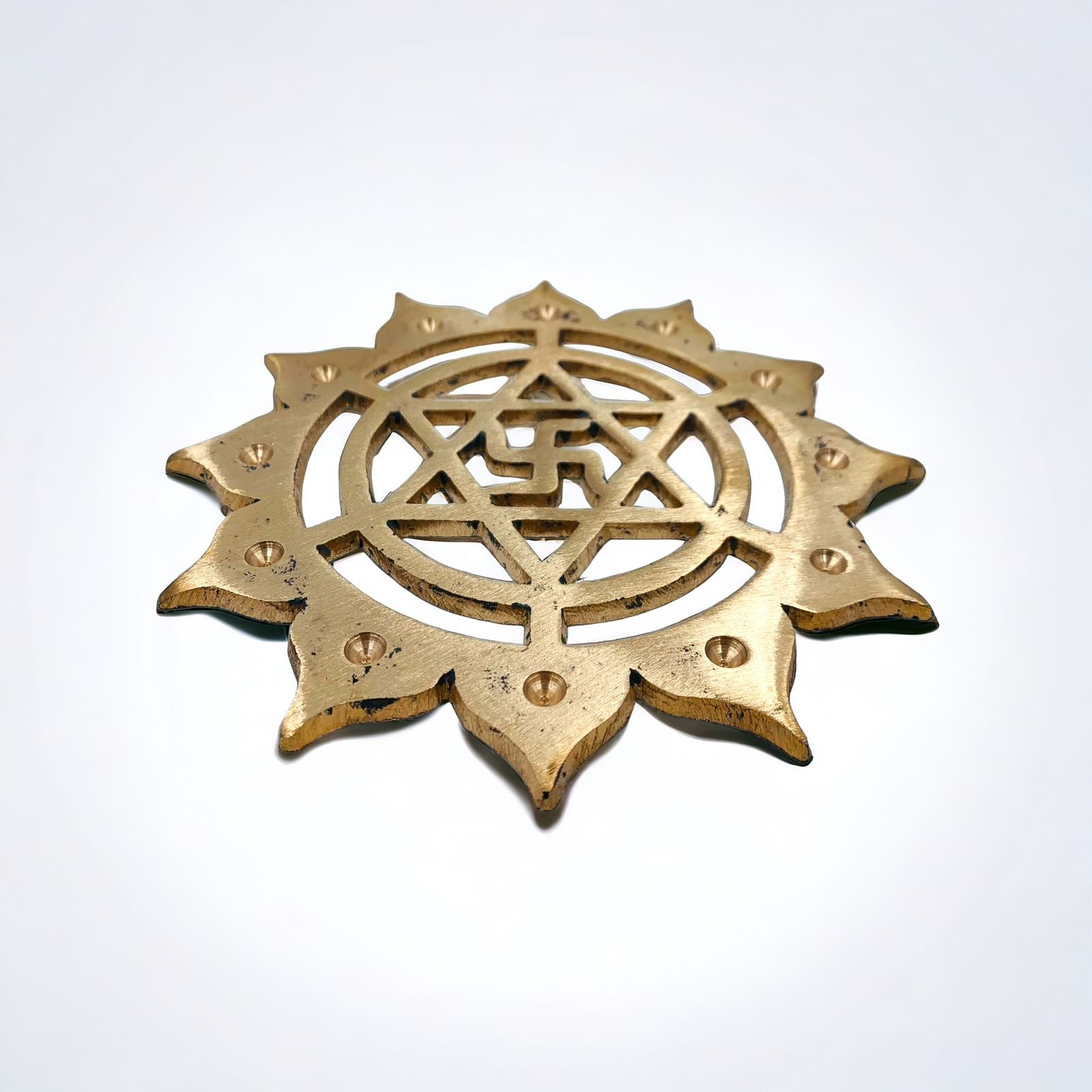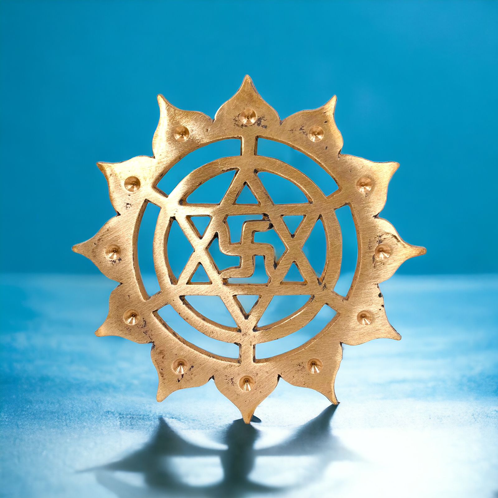 Material :- Brass , Size :- 6x6 inch, No. of Pieces - 2 pcs. It can be concealed in the floor or ceiling / can be hanged. Correct Vastu brings prosperity harmony and peace in a living place.Brass wheel with geopolitical positive symbols swastik, star, tangular, square.Use in direction West, South West , North West